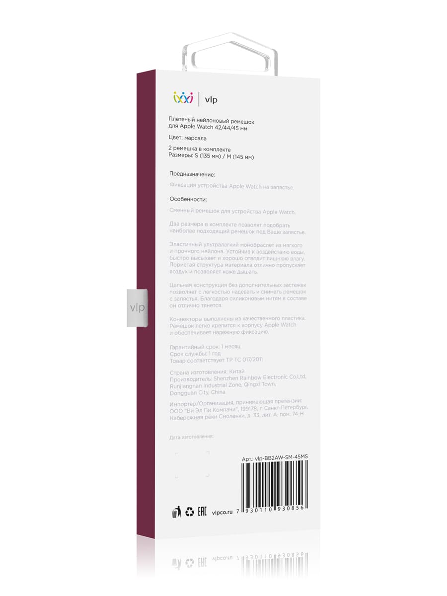 Ремешок нейлоновый плетёный "vlp" для Apple Watch 49/45/44/42mm, S/M, 2шт, марсала