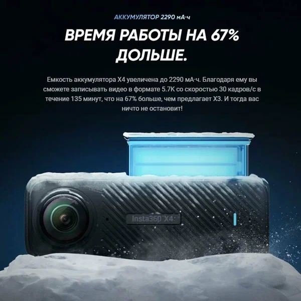 Съемка дольше, без лишних перерывов! Новый аккумулятор на 67% мощнее, чем у предыдущей модели, обеспечивая до 130 минут работы в 5.7K 30FPS.