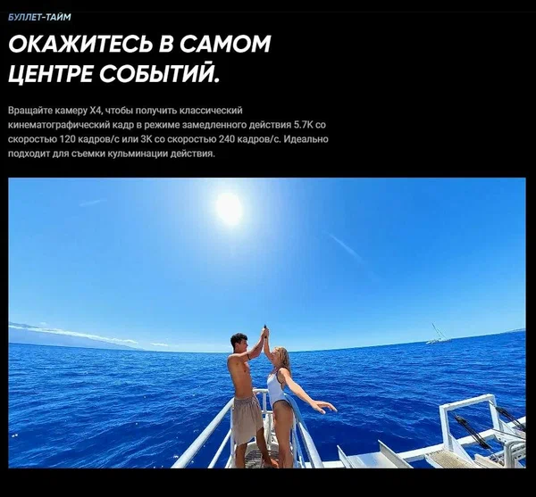 Записывайте динамичные сцены с высокой частотой кадров в 5.7K 60FPS. Идеально подходит для экшн-съемок, активного отдыха и профессионального контента. А для замедленных кадров доступен режим 4K 100FPS.